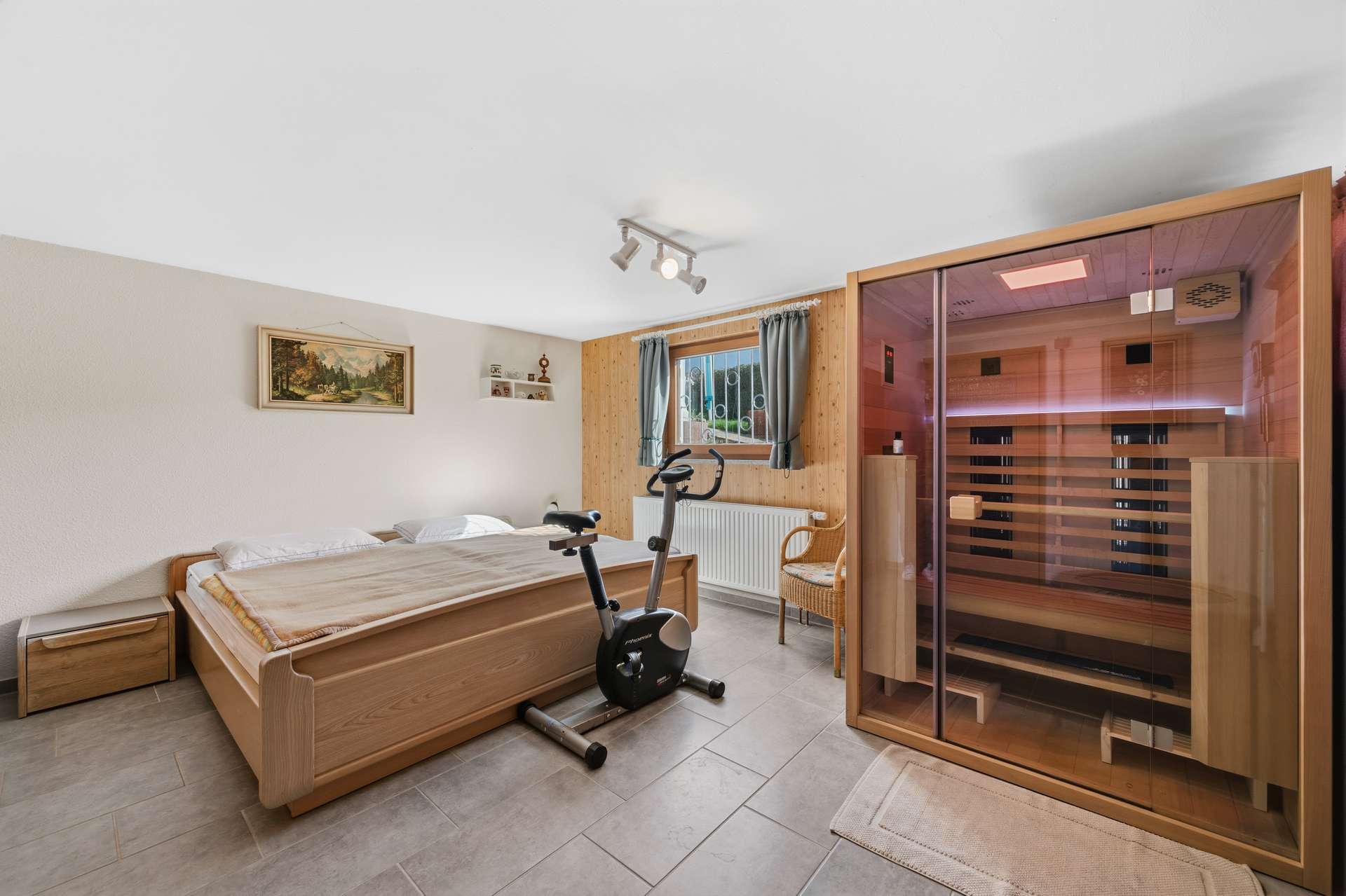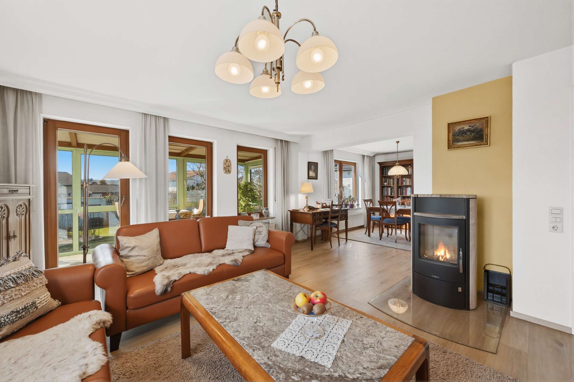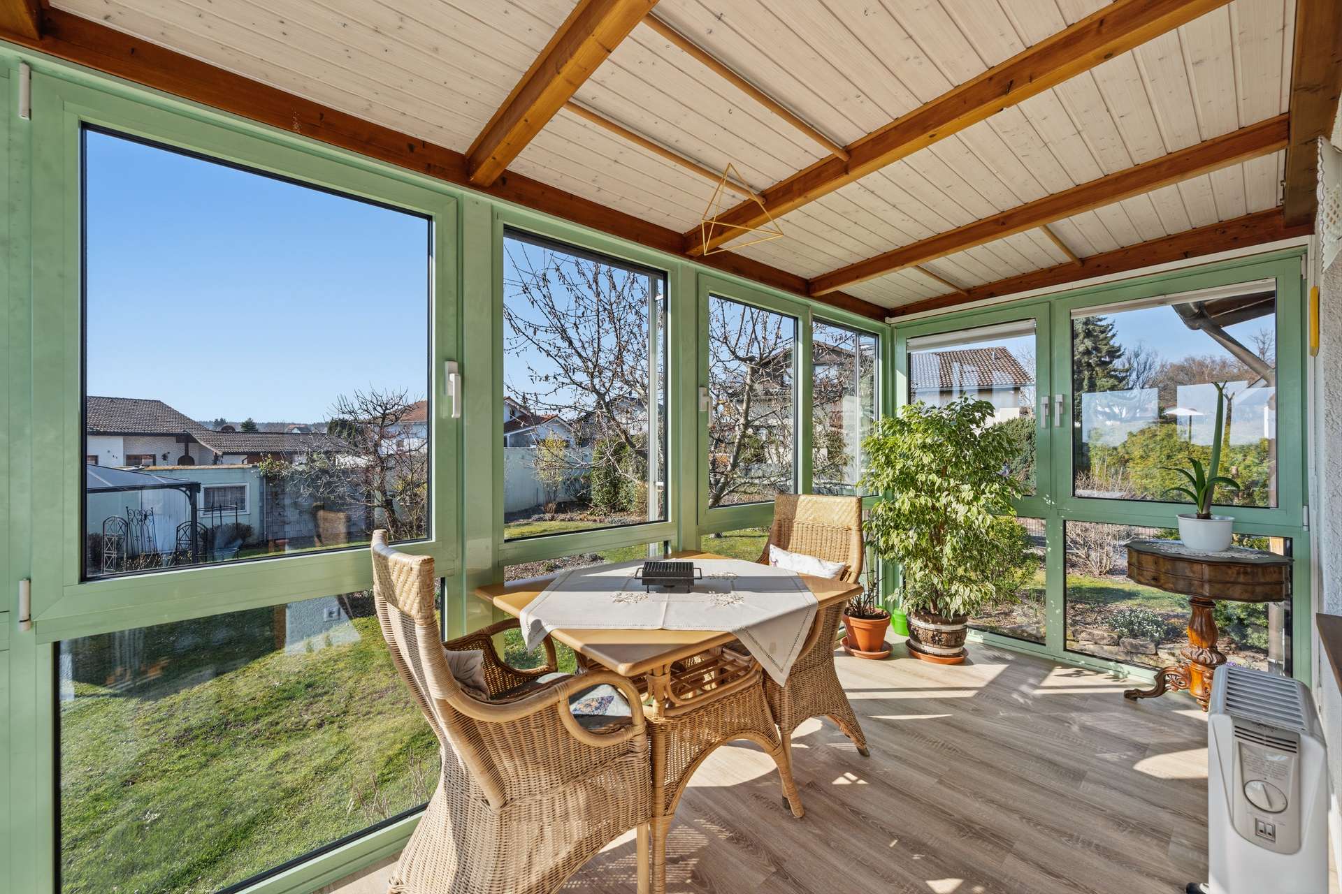 Auch im Inneren überzeugt das Haus mit durchdachten Details und hochwertiger Ausstattung. Zwei stilvolle Bäder sorgen für Komfort und Flexibilität im Alltag. Die hauseigene Sauna bietet eine private Wellnessoase, in der Sie nach einem langen Tag wunderbar entspannen können. Der helle Wintergarten schafft einen fließenden Übergang zwischen Innen- und Außenbereich und schenkt Ihnen zu jeder Jahreszeit einen lichtdurchfluteten Lieblingsplatz mit Blick ins Grüne. Ergänzt wird das Wohlfühlambiente durch einen gemütlichen Kaminofen, der an kühlen Tagen für eine behagliche Wärme und eine besonders stimmungsvolle Atmosphäre sorgt.